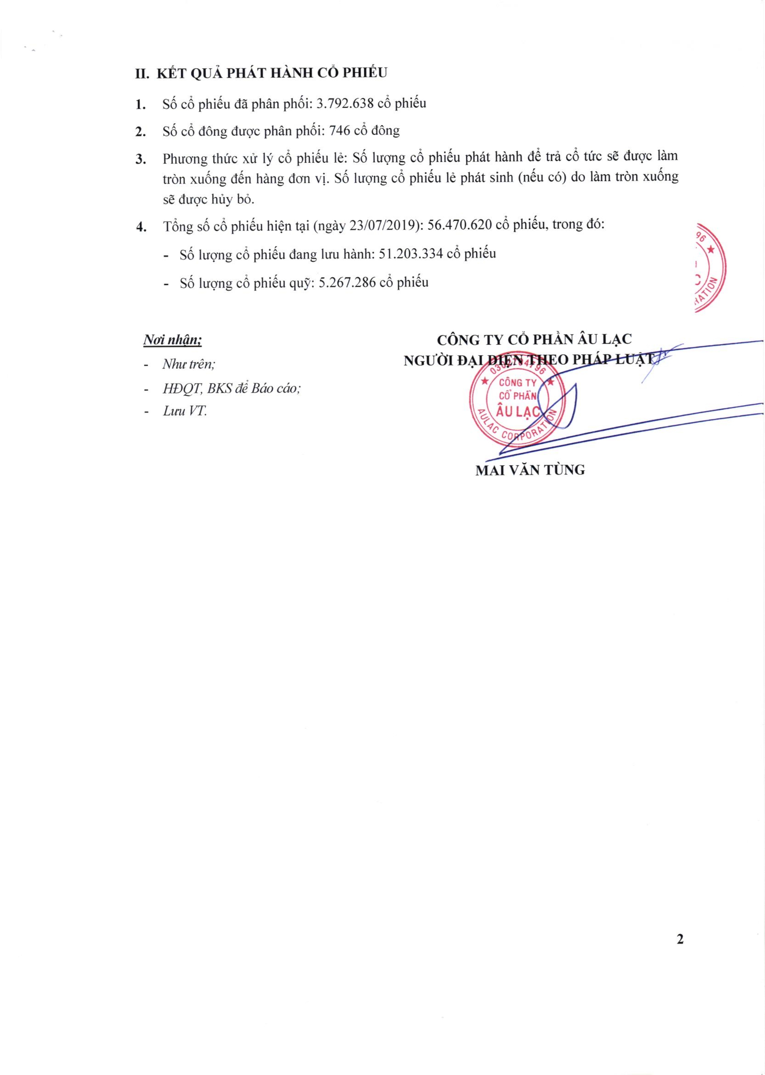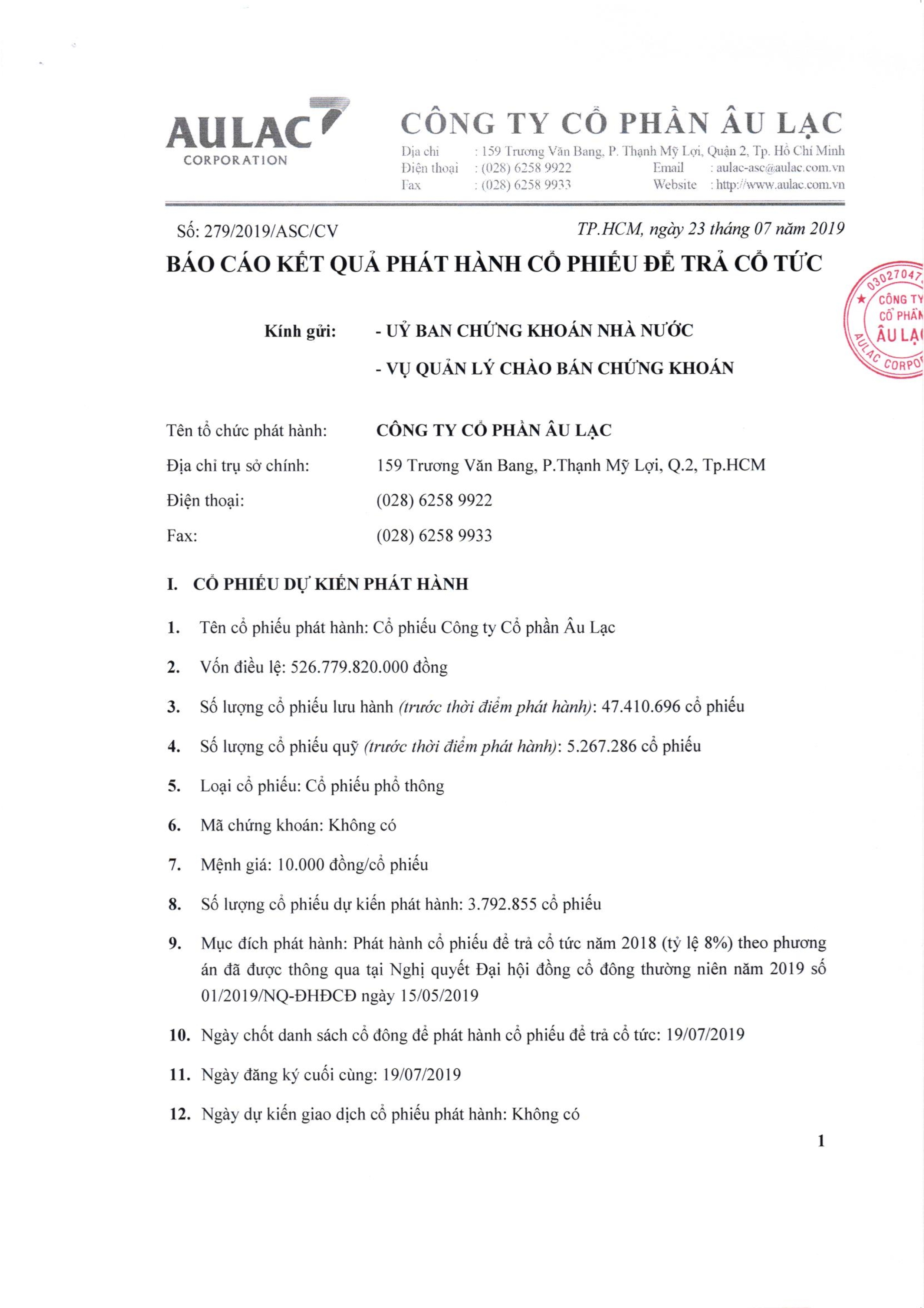 Báo cáo kết quả phát hà nh cổ phiếu để trả cổ tức năm 2018