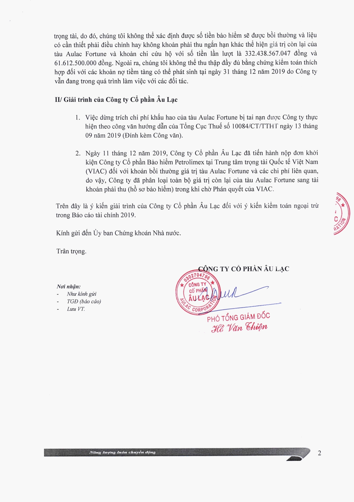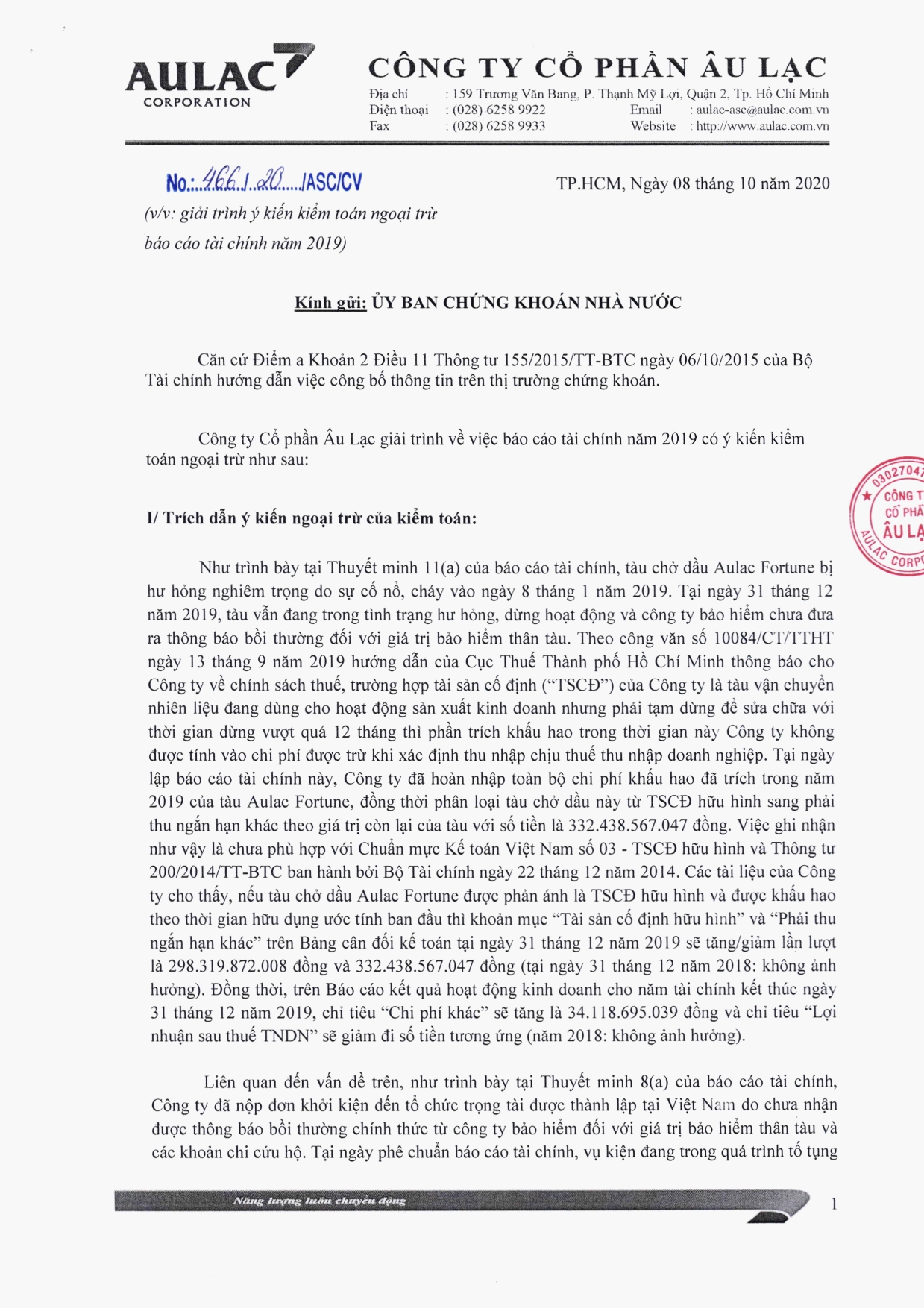 Công bố thông tin về việc giải trình ý kiến kiểm toán ngoại trừ báo cáo tài chính năm 2019