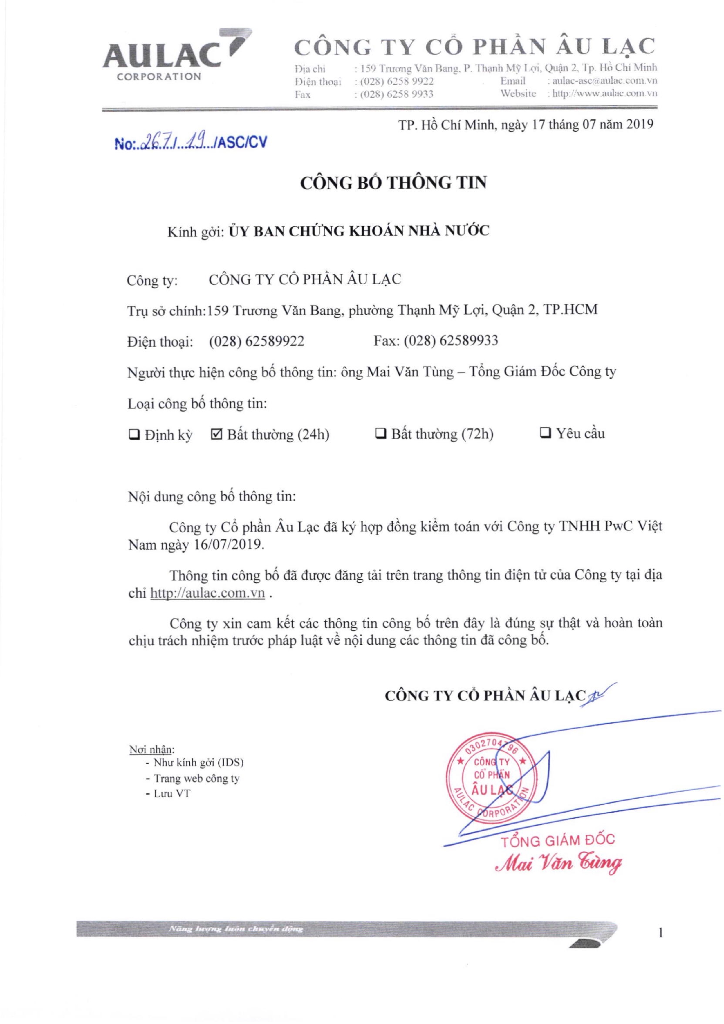 Công bố thông tin về việc ký hợp đồng kiểm toán với Công ty TNHH PwC Việt Nam