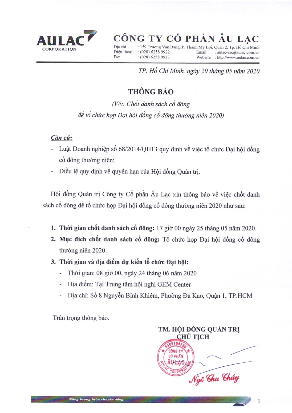 Thông báo chốt danh sách cổ đông để tổ chức họp Đại hội đồng cổ đông thường niên năm 2020