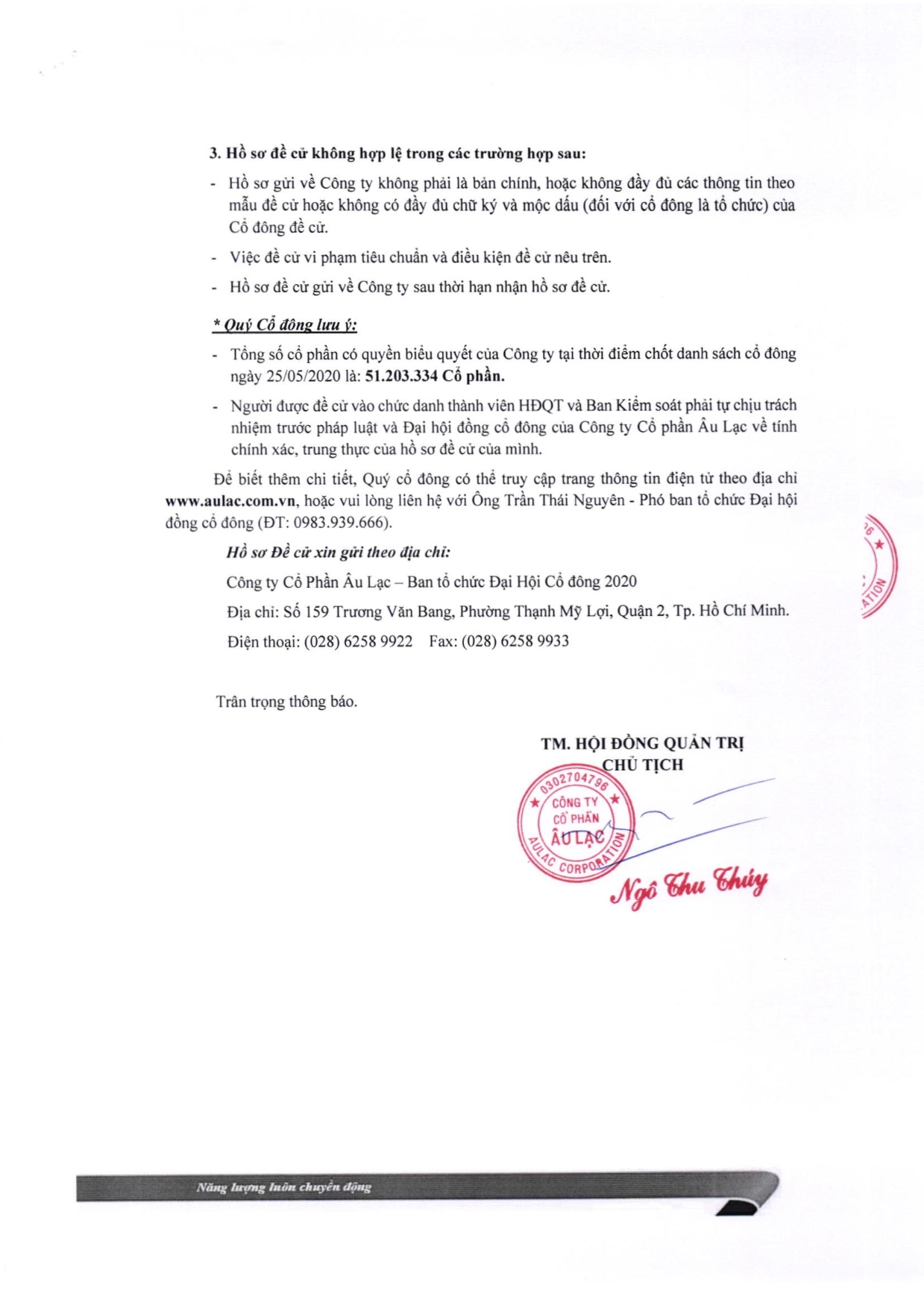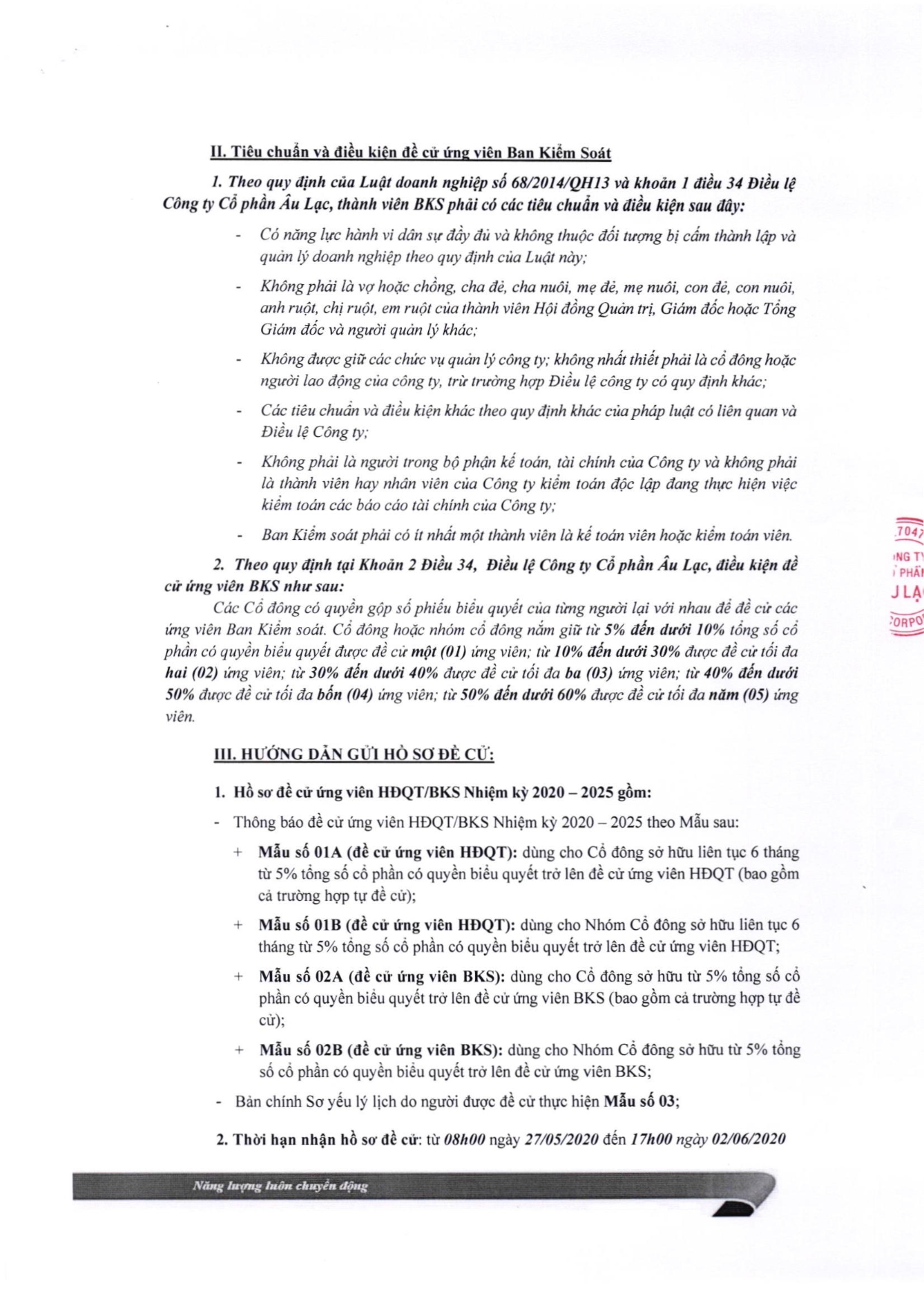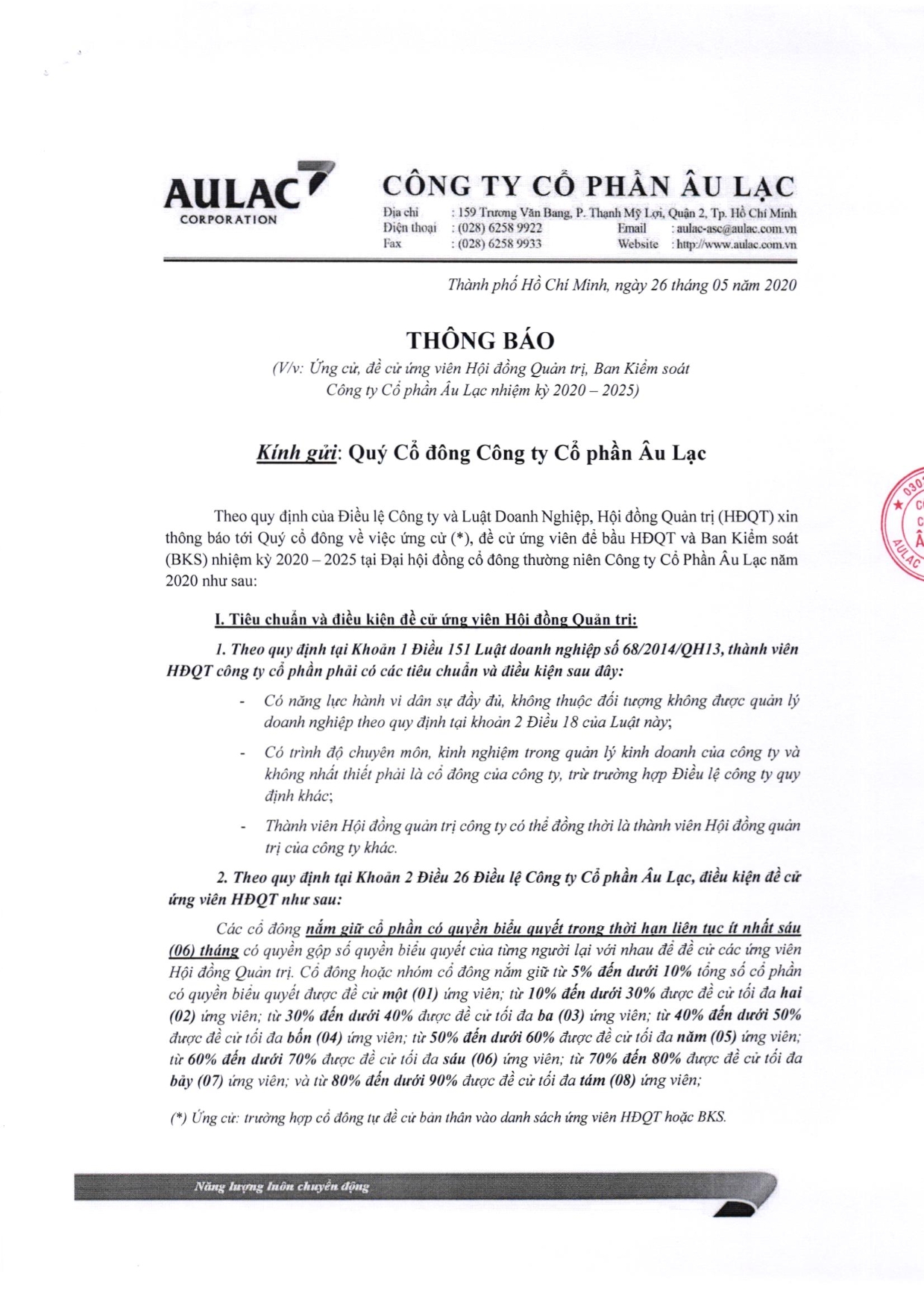 Thông báo về việc ứng cử, đề cử ứng viên Hội đồng Quản trị, Ban Kiểm soát Công ty Cổ phần Âu Lạc nhiệm kỳ 2020 – 2025