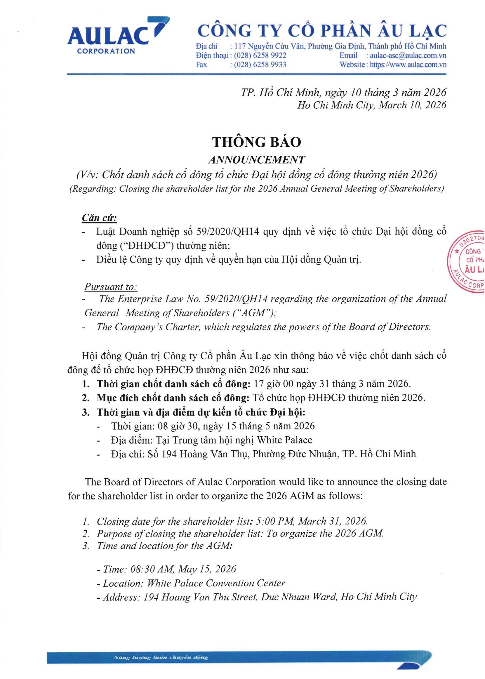 Thông báo chốt danh sách cổ đông để tổ chức đại hội đồng cổ đông thường niên năm 2026 (10/03/2026)